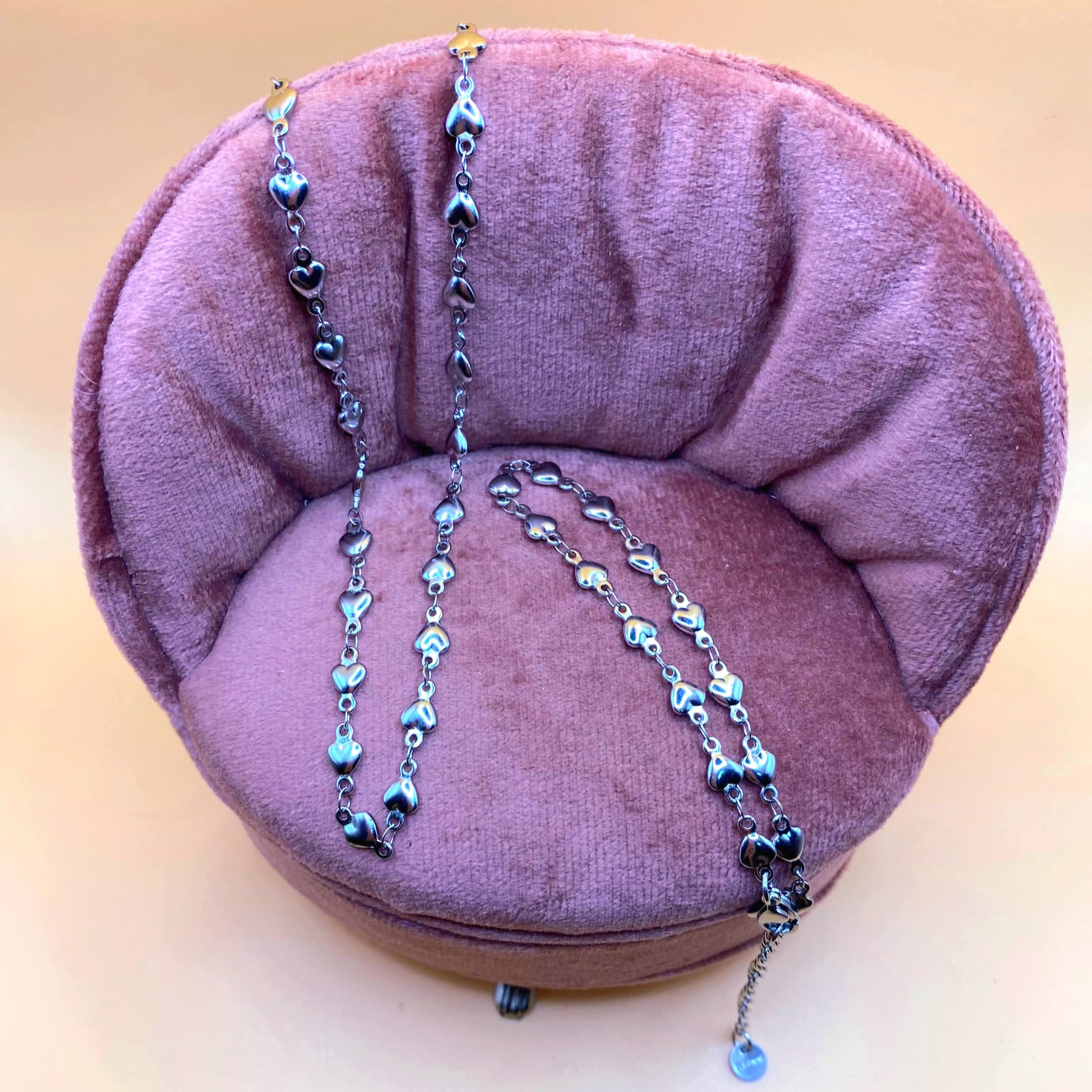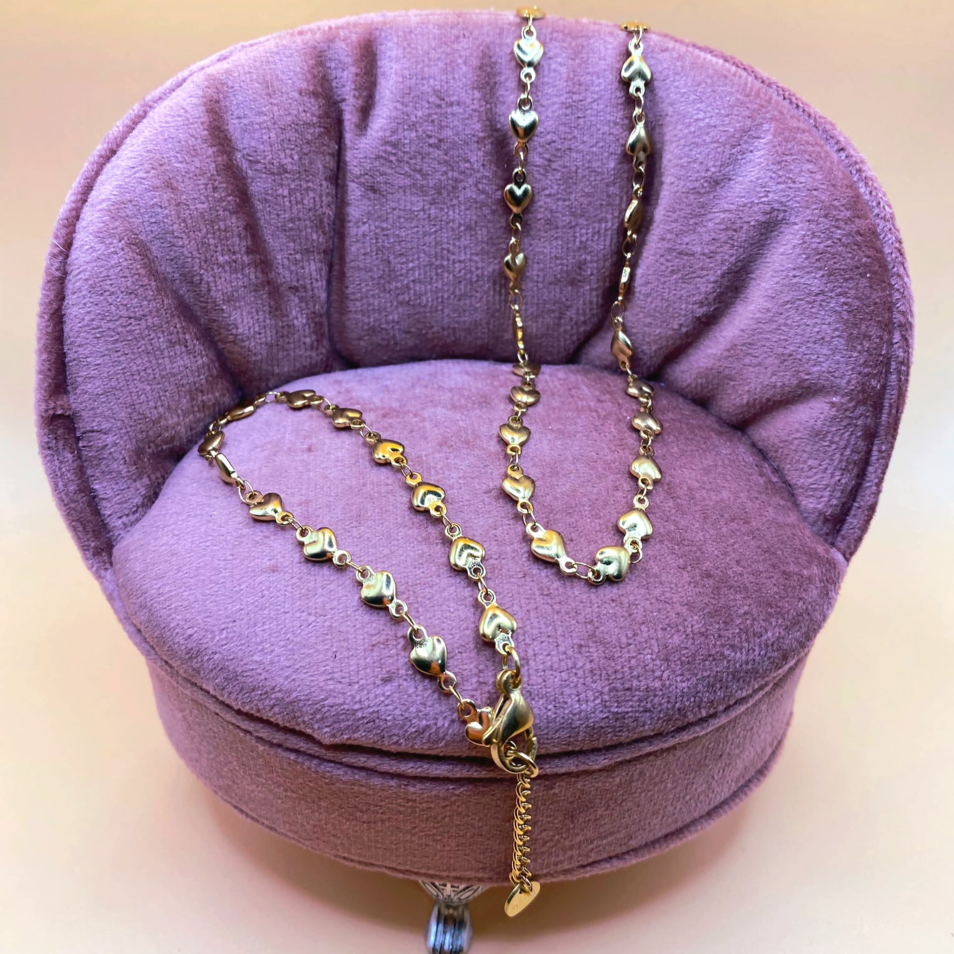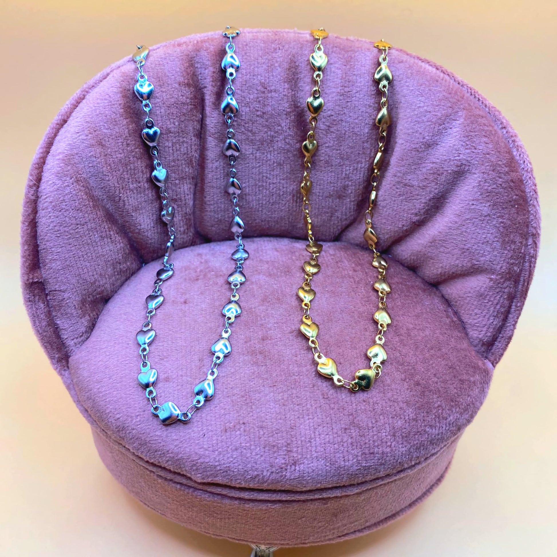 Collana e bracciale in acciaio inossidabile, disponibile nelle colorazioni oro e acciaio.