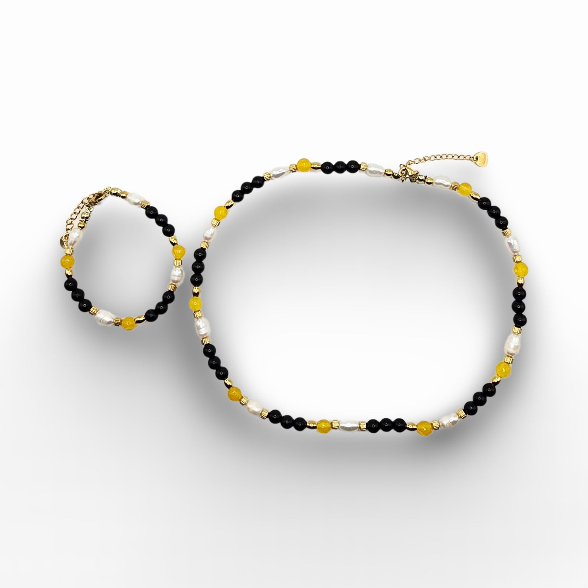 Set composto da collana e bracciale realizzati a mano con perle di fiume, perle di vetro e resina. Acciaio inossidabile, base oro.